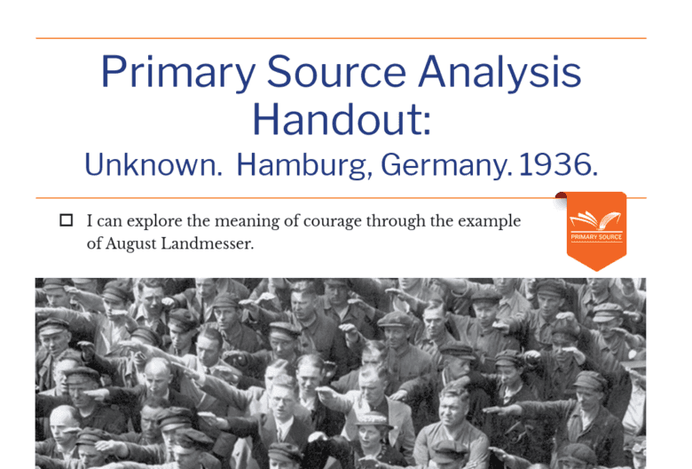 The picture you just analyzed is believed to show shipyard worker August Landmesser (1910 –1944) refusing to perform the Nazi salute at the launch of a naval training vessel in June 1936 in Hamburg, Germany. Landmesser joined the Nazi Party in 1931 but was expelled in 1935 and served jail time for his crime of Rassenschande (dishonoring the race) when he married a Jewish woman. He was later drafted to serve in World War II after being released, and was killed in action in 1944. His wife was taken by the Gestapo (Nazi political police) and sent to three different concentration camps. She is believed to have been killed at the Bernburg Euthanasia Center. The Landmessers’ two children survived the war.