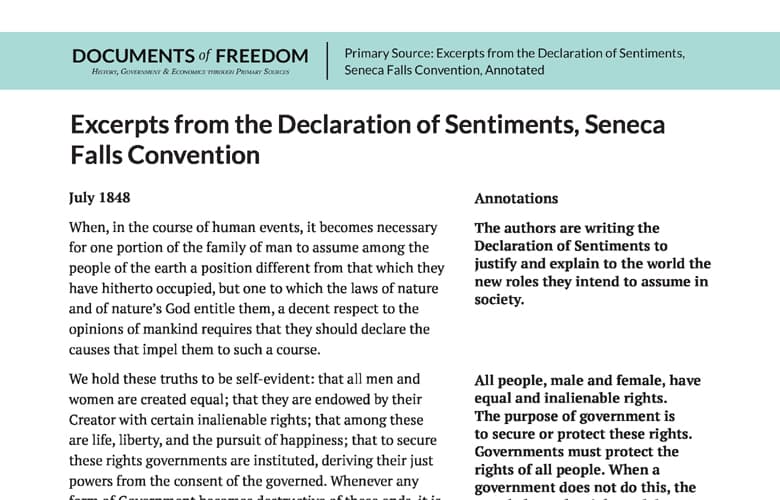 We hold these truths to be self-evident: that all men and women are created equal; that they are endowed by their Creator with certain inalienable rights; that among these are life, liberty, and the pursuit of happiness; that to secure these rights governments are instituted, deriving their just powers from the consent of the governed.2 Whenever any form of Government becomes destructive of these ends, it is the right of those who suffer from it to refuse allegiance to it, and to insist upon the institution of a new government, laying its foundation on such principles, and organizing its powers in such form as to them shall seem most likely to effect their safety and happiness. Prudence, indeed, will dictate that governments long established should not be changed for light and transient causes; and accordingly, all experience hath shown that mankind are more disposed to suffer, while evils are sufferable, than to right themselves by abolishing the forms to which they are accustomed. But when a long train of abuses and usurpations, pursuing invariably the same object, evinces a design to reduce them under absolute despotism, it is their duty to throw off such government, and to provide new guards for their future security. Such has been the patient sufferance of the women under this government, and such is now the necessity which constrains them to demand the equal station to which they are entitled.