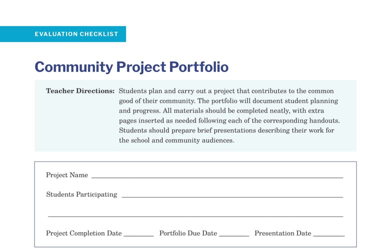 Students plan and carry out a project that contributes to the common good of their community. The portfolio will document student planning and progress. All materials should be completed neatly, with extra pages inserted as needed following each of the corresponding handouts. Students should prepare brief presentations describing their work for the school and community audiences.