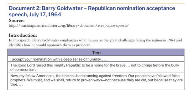 Excerpts of “Daisy” TV advertisement for Lyndon B. Johnson (1964), Barry Goldwater – Republican nomination acceptance speech, July 17, 1964, and “Your children will be communists” TV advertisement for Barry Goldwater, 1964 and corresponding questions.