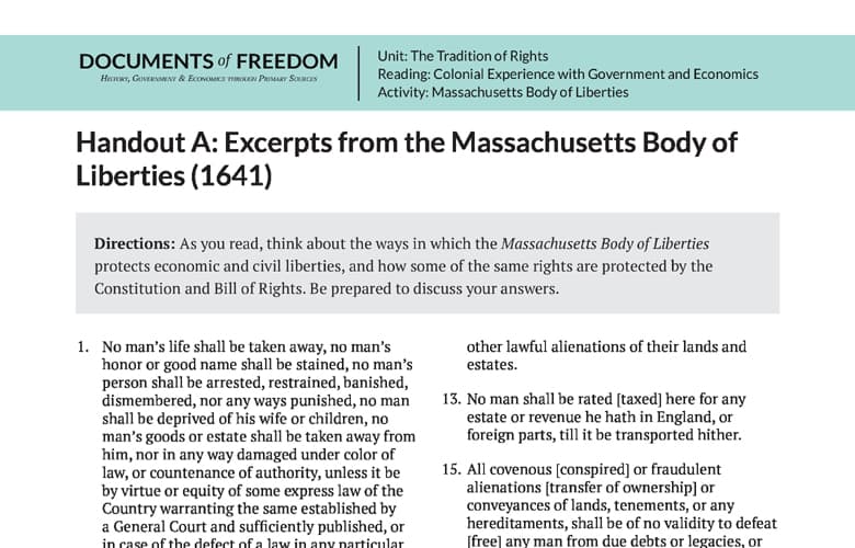 Directions: As you read, think about the ways in which the Massachusetts Body of Liberties protects economic and civil liberties, and how some of the same rights are protected by the Constitution and Bill of Rights. Be prepared to discuss your answers.
