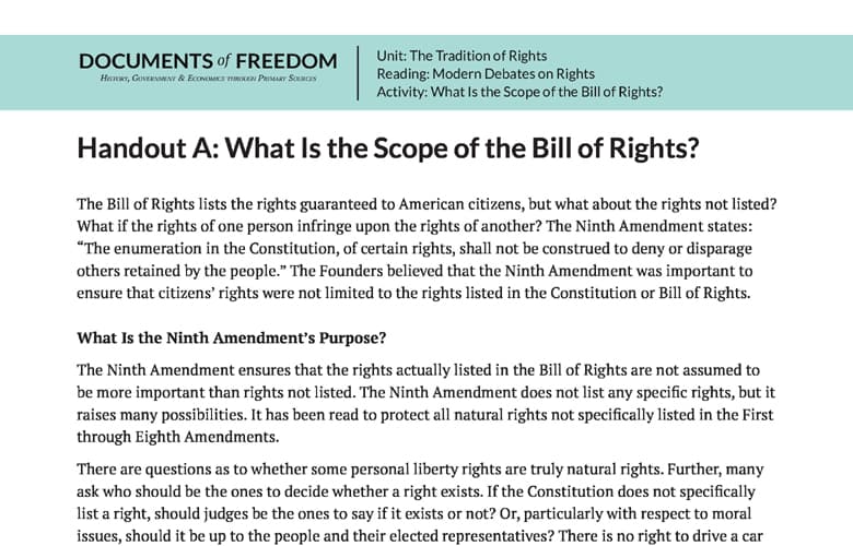 The Bill of Rights lists the rights guaranteed to American citizens, but what about the rights not listed? What if the rights of one person infringe upon the rights of another? The Ninth Amendment states: “The enumeration in the Constitution, of certain rights, shall not be construed to deny or disparage others retained by the people.” The Founders believed that the Ninth Amendment was important to ensure that citizens’ rights were not limited to the rights listed in the Constitution or Bill of Rights.