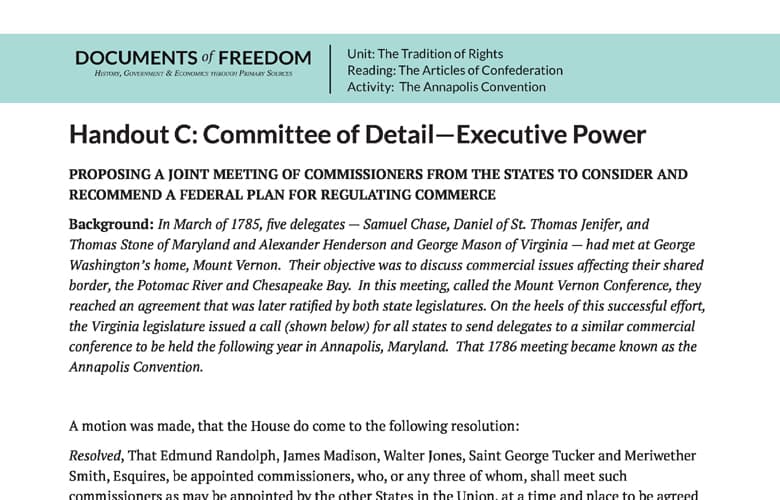 Background: In March of 1785, five delegates — Samuel Chase, Daniel of St. Thomas Jenifer, and Thomas Stone of Maryland and Alexander Henderson and George Mason of Virginia — had met at George Washington’s home, Mount Vernon. Their objective was to discuss commercial issues affecting their shared border, the Potomac River and Chesapeake Bay. In this meeting, called the Mount Vernon Conference, they reached an agreement that was later ratified by both state legislatures. On the heels of this successful effort, the Virginia legislature issued a call (shown below) for all states to send delegates to a similar commercial conference to be held the following year in Annapolis, Maryland. That 1786 meeting became known as the Annapolis Convention.