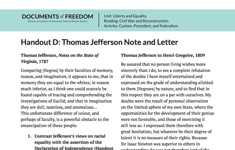- Contrast Jefferson’s views on racial equality with the assertion of the Declaration of Independence (Handout C).