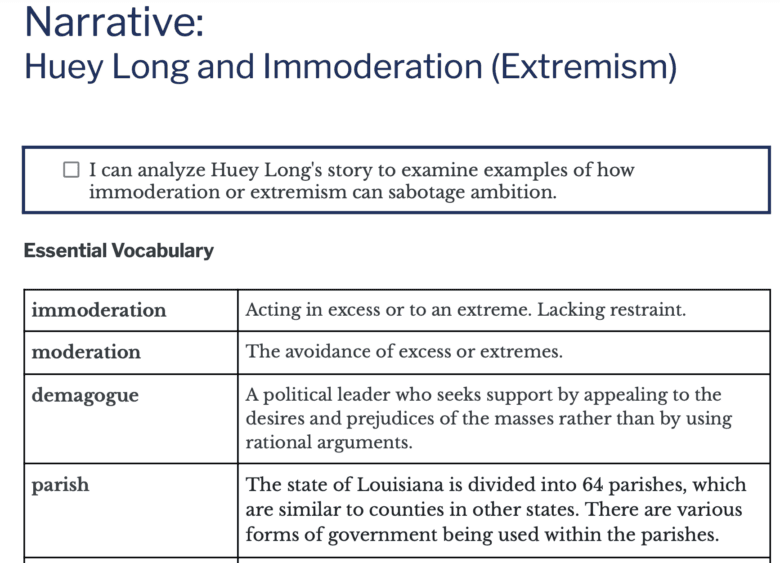 - I can analyze Huey Long’s story to examine examples of how immoderation or extremism can sabotage ambition