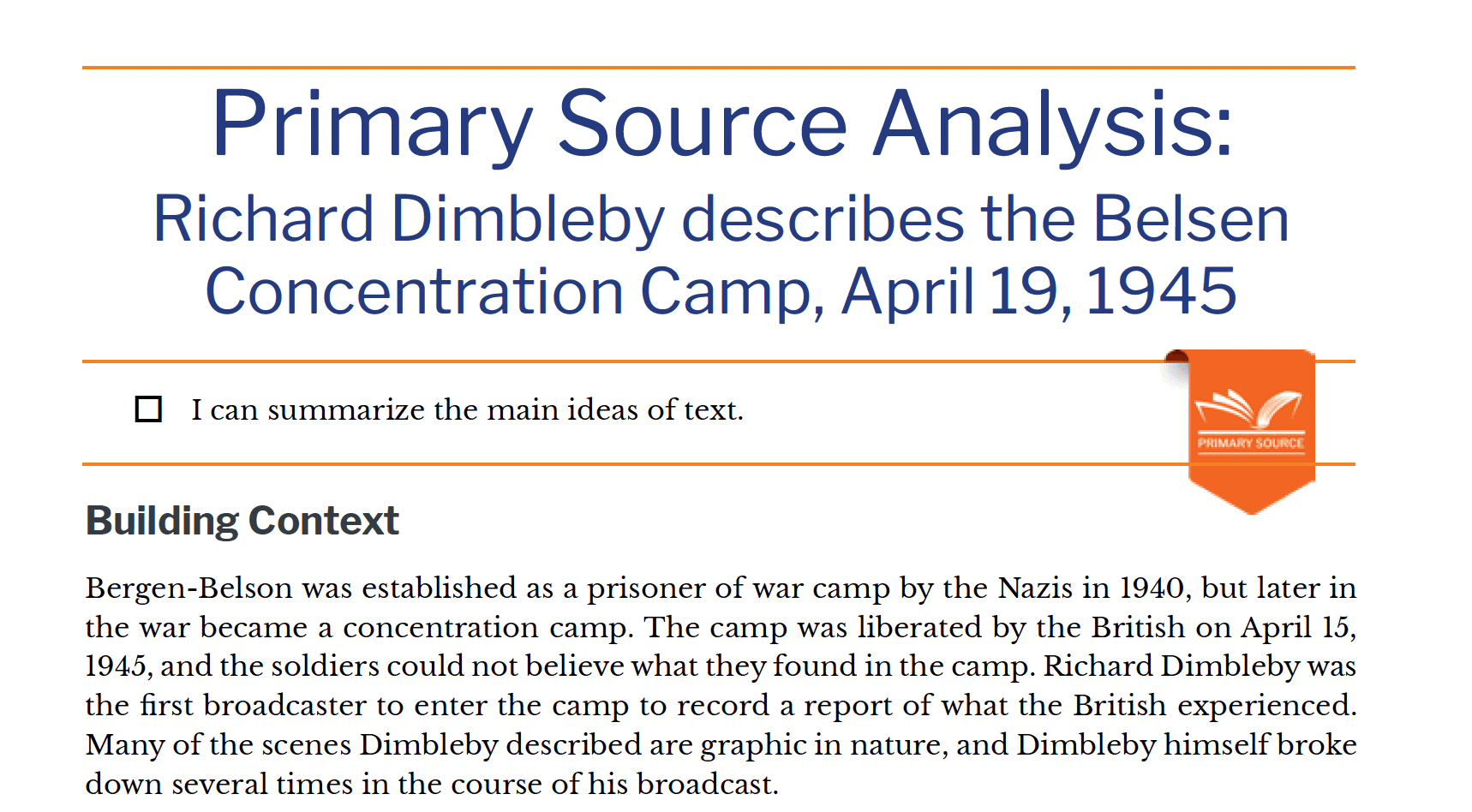 Bergen-Belson was established as a prisoner of war camp by the Nazis in 1940, but later in the war became a concentration camp. The camp was liberated by the British on April 15, 1945, and the soldiers could not believe what they found in the camp. Richard Dimbleby was the first broadcaster to enter the camp to record a report of what the British experienced. Many of the scenes Dimbleby described are graphic in nature, and Dimbleby himself broke down several times in the course of his broadcast.