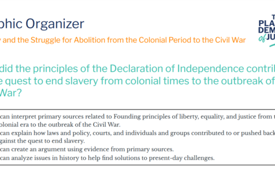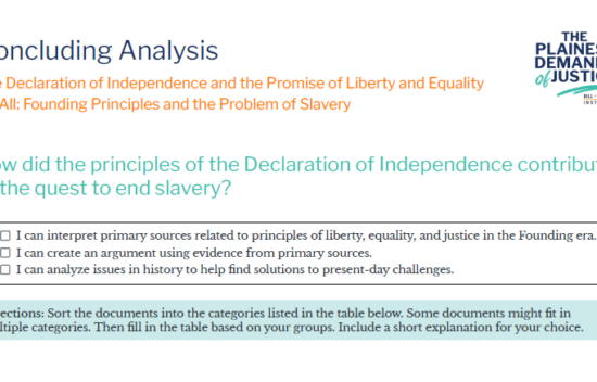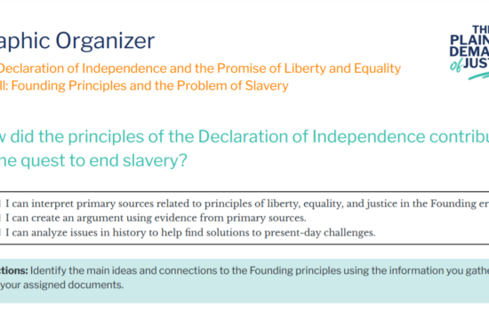 The Declaration of Independence and the Promise of Liberty and Equality for All: Founding Principles and the Problem of SlaveryAnalyze primary source documents to determine the extent to which the writing of the Declaration of Independence contributed to the quest to end slavery in the United States in the Founding era. |