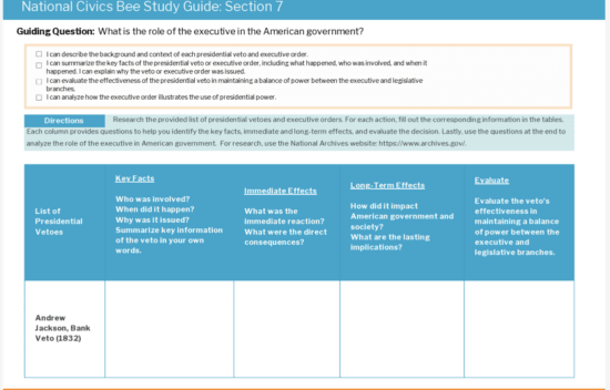 A graphic organizer to assist students in understanding background, context, and effectiveness of presidential vetoes and executive orders.