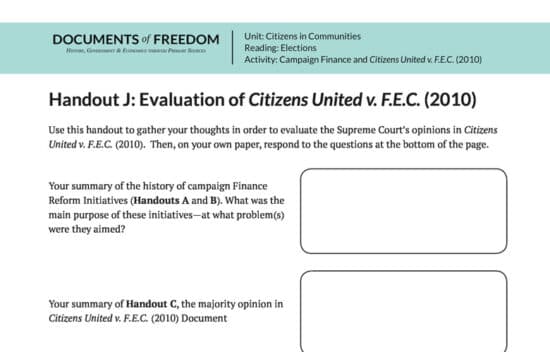 Case background and primary source documents concerning the Supreme Court case of Citizens United v. F.E.C. Dealing with free speech in the political arena, this lesson asks students to asses whether or not the Supreme Court ruled correctly in Citizens United in light of constitutional principles including republican government, freedom of speech, and property rights.