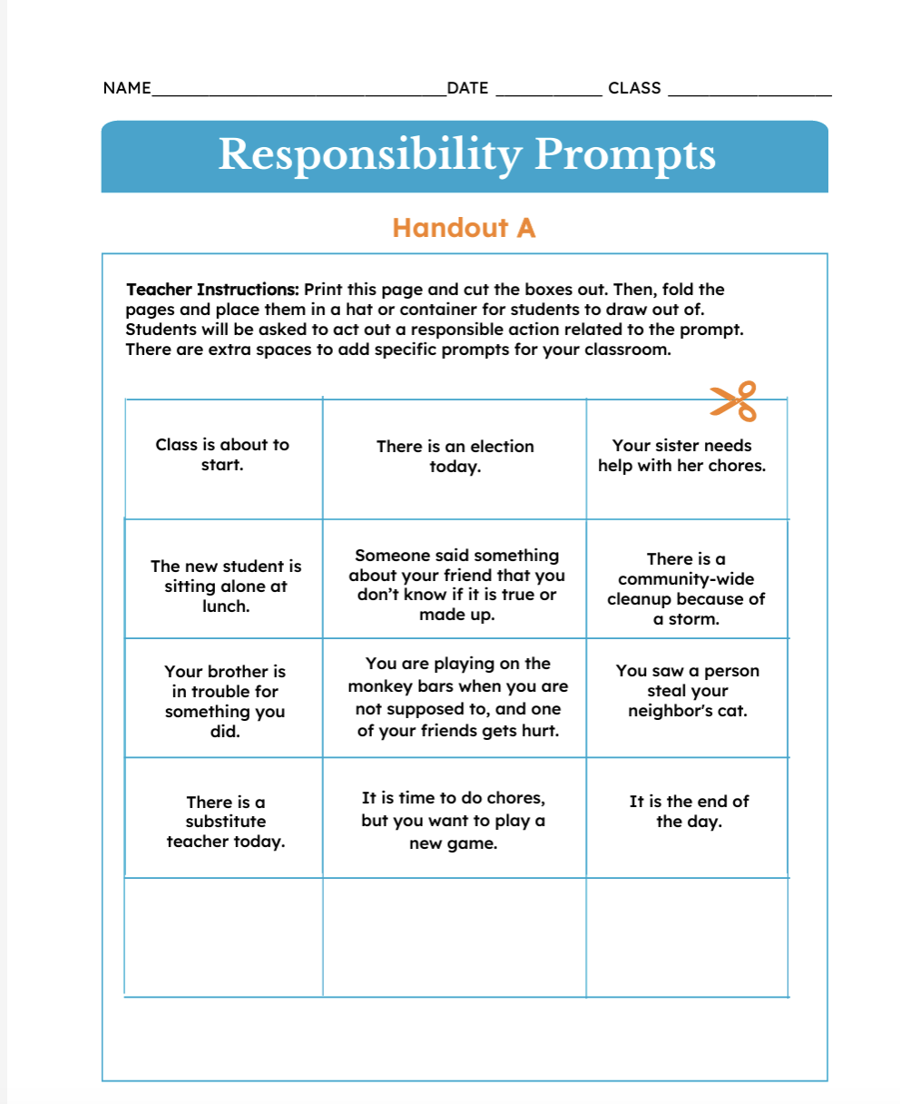 Page:Resources LibraryArrow iconCurriculum:ElementaryResponsibility PromptsMore of this CategoryE LessonResponsibility in Communities | Elementary E-LessonWhat responsibilities do we have to our community?