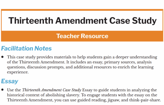 - This case study provides materials to help students gain a deeper understanding of the Thirteenth Amendment. It includes an essay, primary sources, analysis questions, discussion prompts, and additional resources to enrich the learning experience.