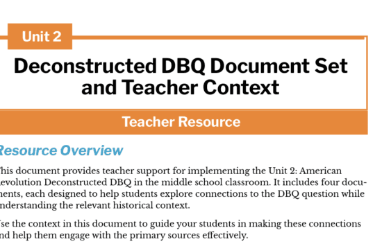 This document provides teacher support for implementing the Unit 2: American Revolution Deconstructed DBQ in the middle school classroom. It includes four documents, each designed to help students explore connections to the DBQ question while understanding the relevant historical context.