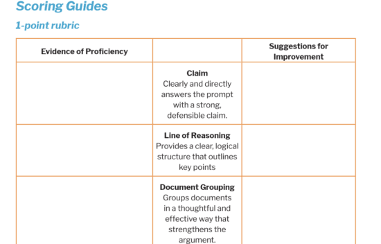 | Document Grouping | Groups documents in a thoughtful and effective way that strengthens the argument. | Groups documents in a logical way that supports the argument | Groups documents, but the connections may be weak or unclear. | Does not group documents or groups them in a way that does not support the argument. |
