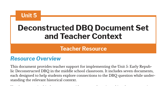Educator ResourceUnit 5: Early Republic Deconstructed DBQ Document Set and Teacher ContextSupport for implementing the Unit 5: Early Republic Deconstructed DBQ in the middle school classroom.
